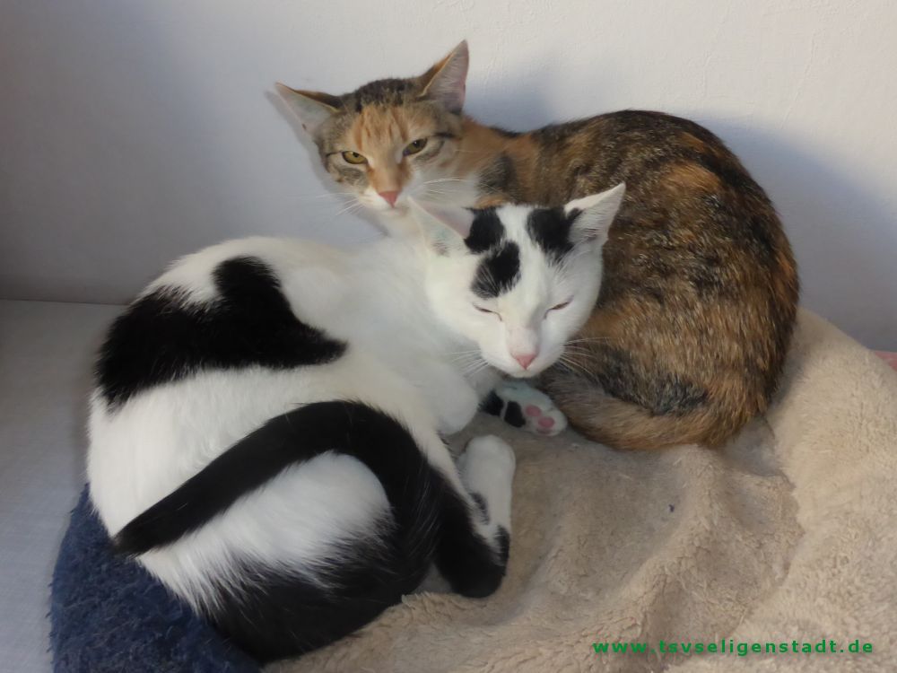 Bilbo (männlich, schwarz/weiß) und Sally (weiblich, tricolor) sind Geschwister und landeten aufgrund einer Fangaktion beim TSV. Obwohl beide schon eine Weile auf einer privaten Pflegestelle sind, zeigen sie sich Fremden gegenüber immer noch sehr ängstlich. Der größere Hasenfuß ist definitiv Bilbo, der sich sehr an seiner Schwester orientiert. Hier sind geduldige Menschen gefragt, die dem Pärchen Zeit zur Eingewöhnung lassen. Ist das Pflegefrauchen alleine mit den beiden, dann zeigen sie sich verschmust und frech. D.h. hier gibt es Entwicklungspotenzial für zwei ganz tolle Tiere! Beide möchten nach einer gewissen Eingewöhnungszeit wieder durch Nachbars Gärten streifen können.