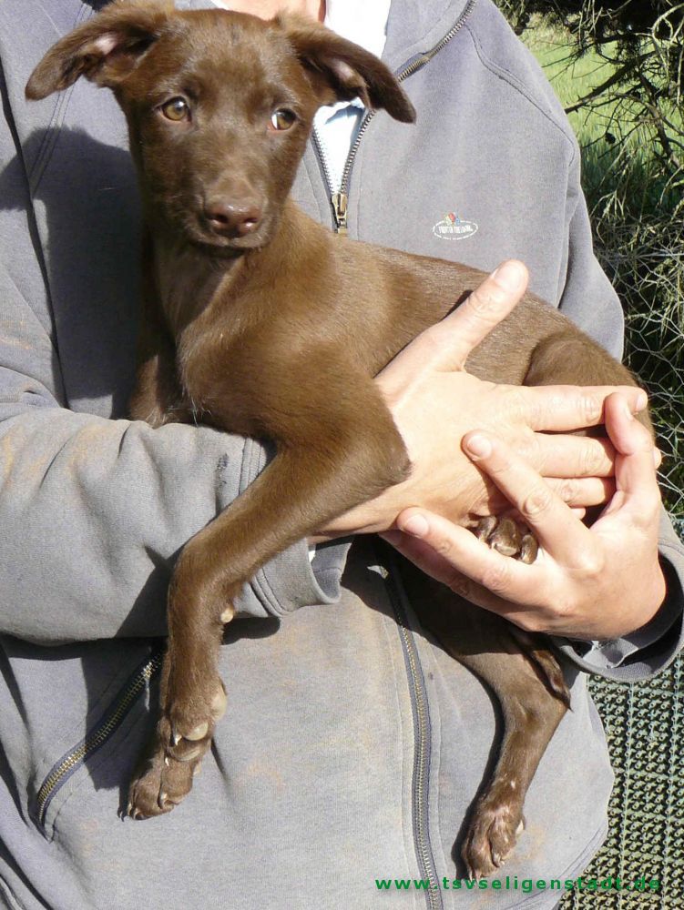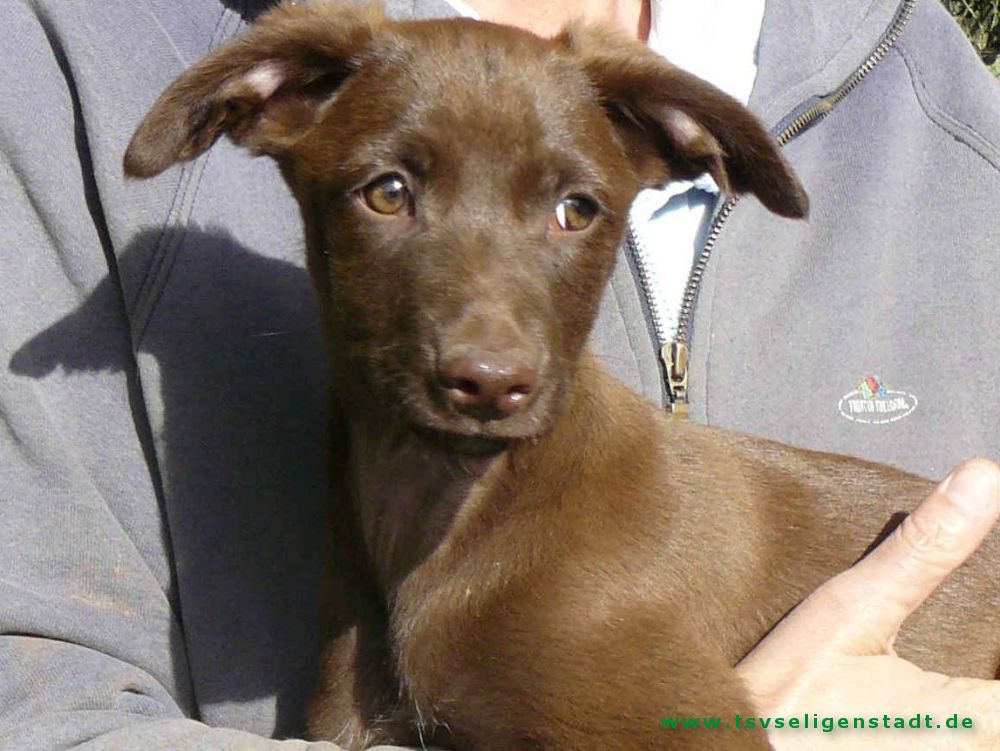 Chocolate ist ein wunderhübscher schokoladenfarbiger Junghund der anfangs etwas schüchtern und zurückhaltend ist.