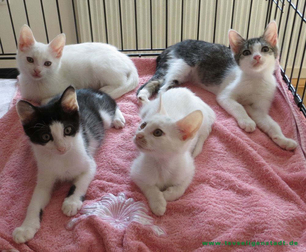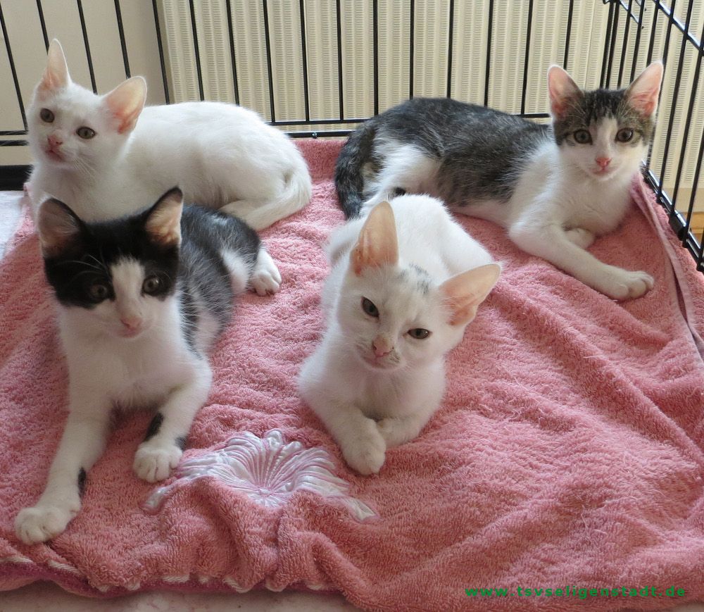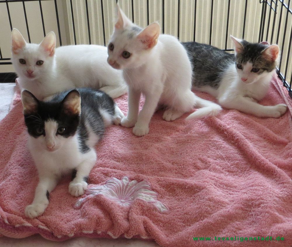 4 ehemalige Bauernhofkiten suchen einen neuen Wirkungskreis. Die Babies sind zahm und werden zu zweit oder zu anderer Katzengesellschaft abgegeben. Alterstypisch sind sie neugierig und verspielt.