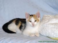 Mimi kam mit 6 Wochen unterernährt und krank zu uns, sie wurde gefunden. Inzwischen ist sie gesund und eine verspielte Katze. Bei unbekannten Menschen versteckt sie sich erst einmal, was aber nach kurzer Zeit schon vergessen ist.
