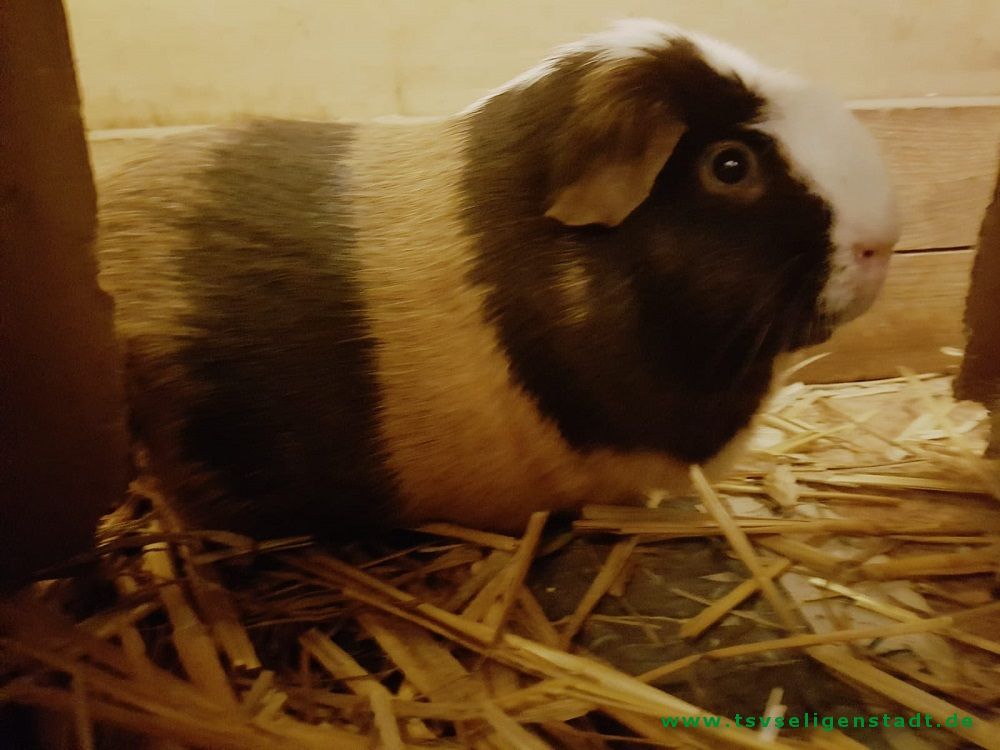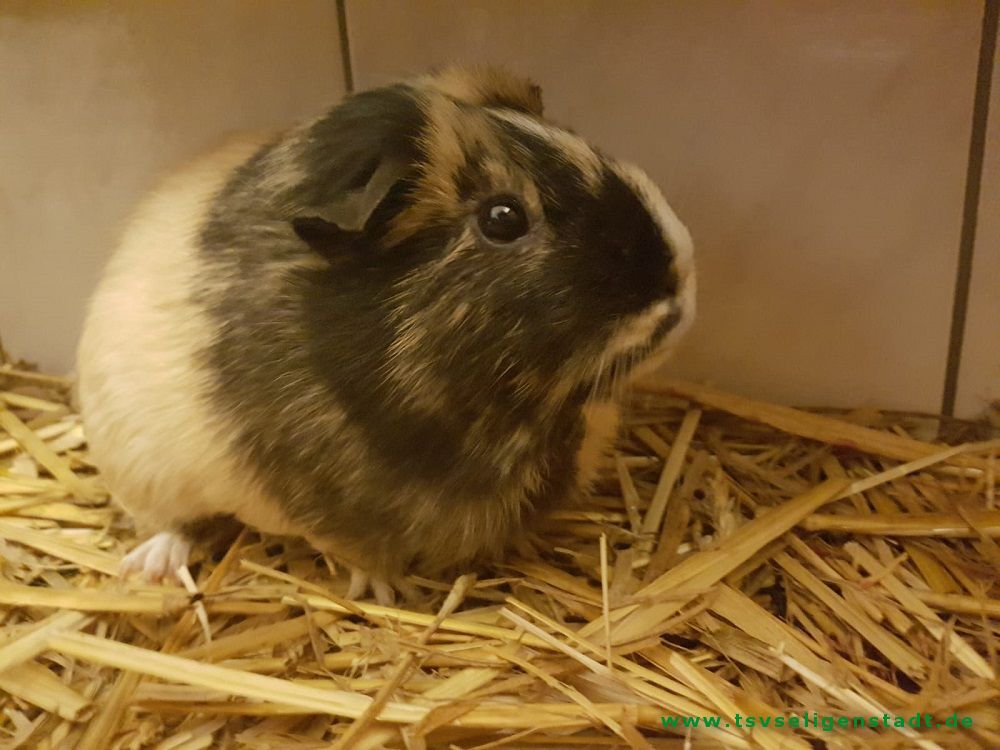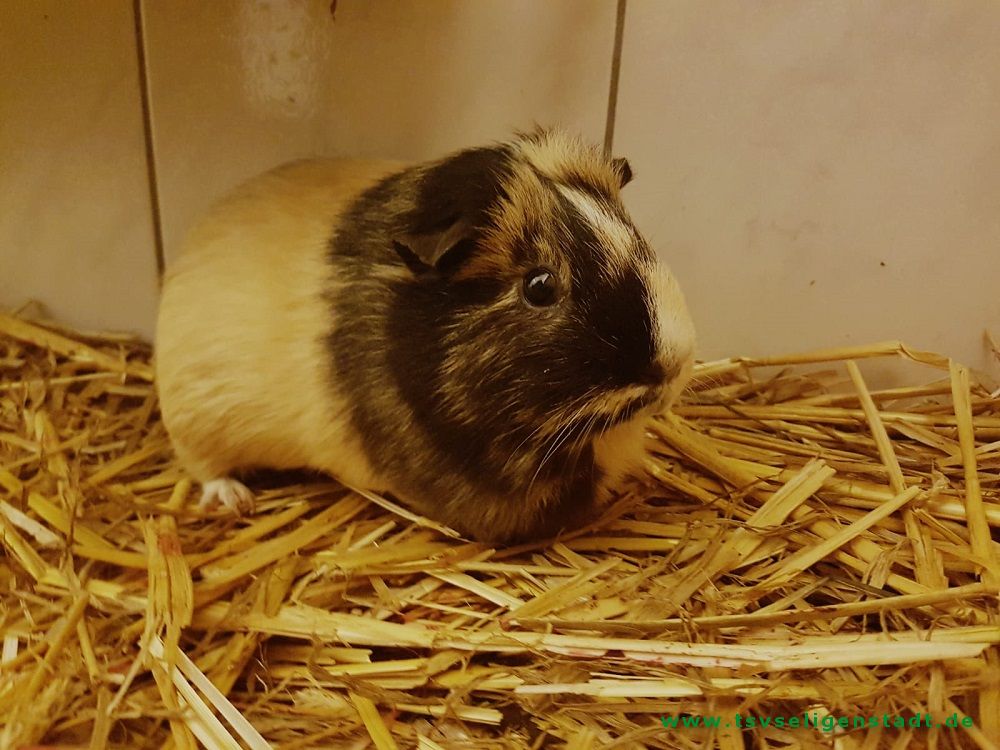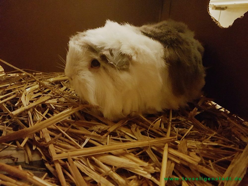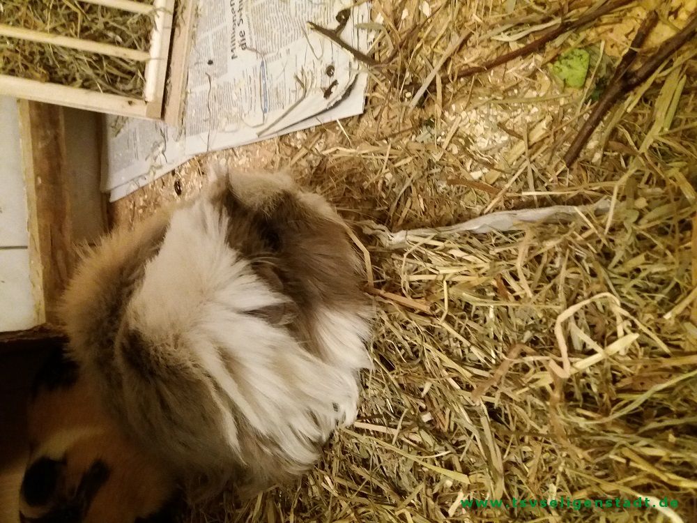 Tac ist das einzige Rosettenmeerschweinchen, wobei ihr Fell pflegeleicht ist. Es muss nur hintenherum etwas kurz gehalten werden, damit es nicht zu Verschmutzungen und dadurch zu Erkrankungen kommt.