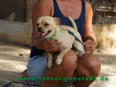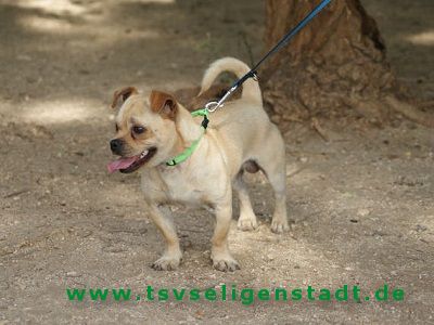 Kiko ist ein Mopsmischling und richtig gut drauf. Er möchte raufen, Ball spielen, Stöckchen holen, eben ein agiler kleiner Wonneproppen, dem der Schalk im Nacken sitzt.