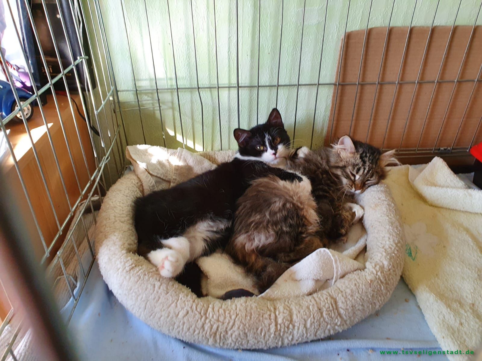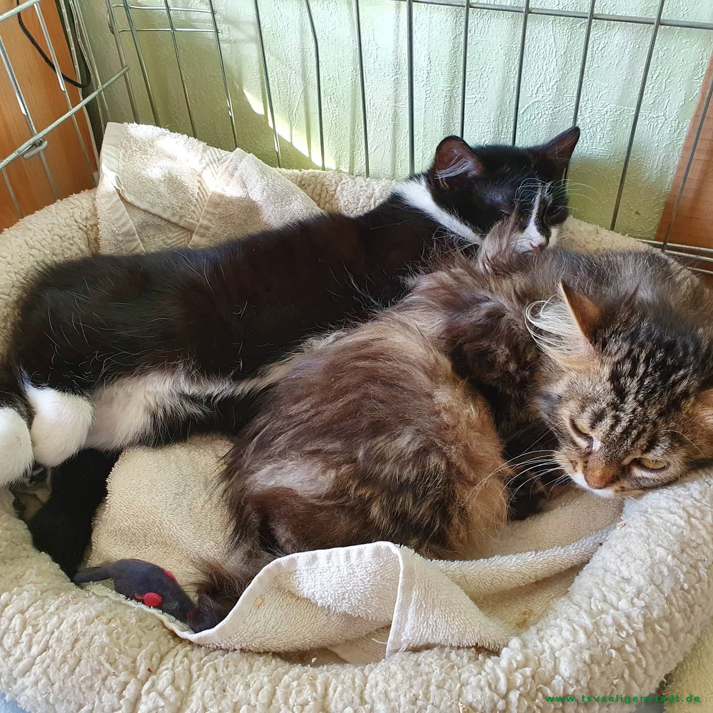 Die Brüder gehören zu den „berühmten" Fundkatzen aus Rodgau und suchen nun eine Wohnung oder ein Haus mit vernetztem Balkon. Die zwei Wohnungskater sollen keinen Freigang bekommen. Sie sind beide total aufeinander fixiert und spielen den ganzen Tag miteinander, außer -Sie haben die Möglichkeit, gekrault zu werden, dann lieben sie es, zu schmusen und zu schnurren. Die beiden hatten eine schwere Anfangszeit, der Langhaarkater Phönix mit einer sehr schweren Rachitis und Jonas mit einer leichteren Rachitis. Phönix hat deswegen Probleme beim Laufen und schwache Hinterpfoten. Er hat zudem noch Defizite beim Springen, die sich aber im Laufe der Zeit verbessern können, aber nicht müssen.