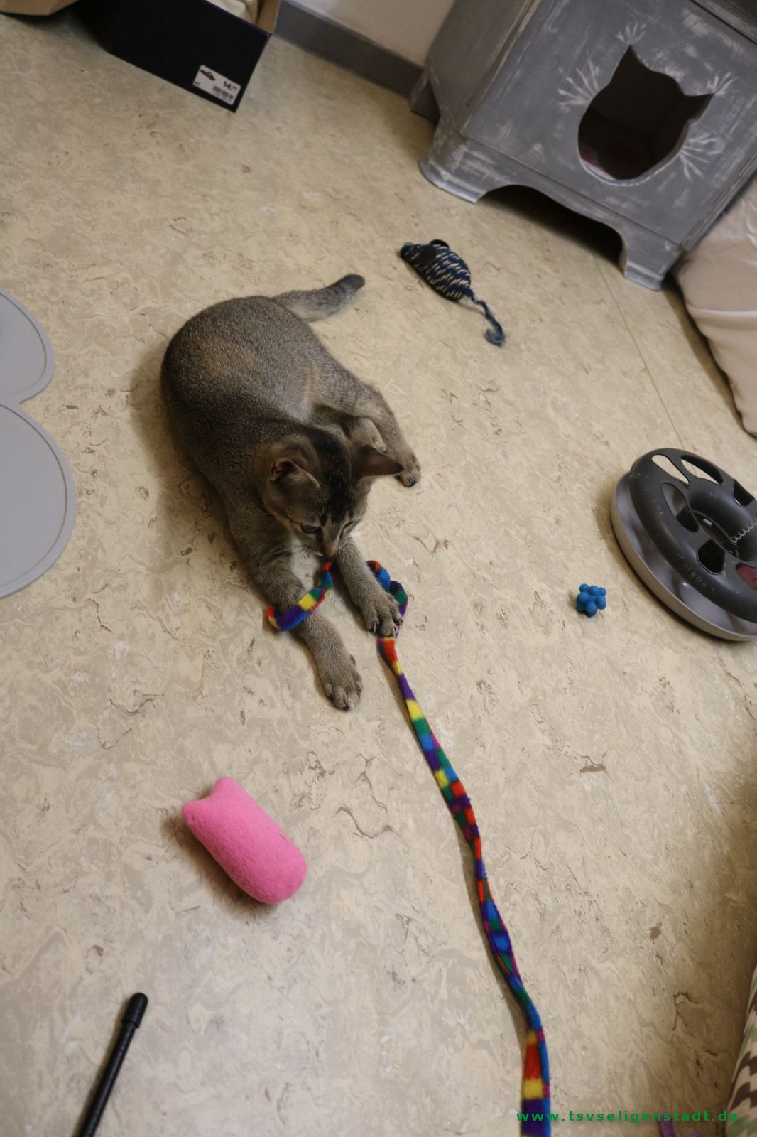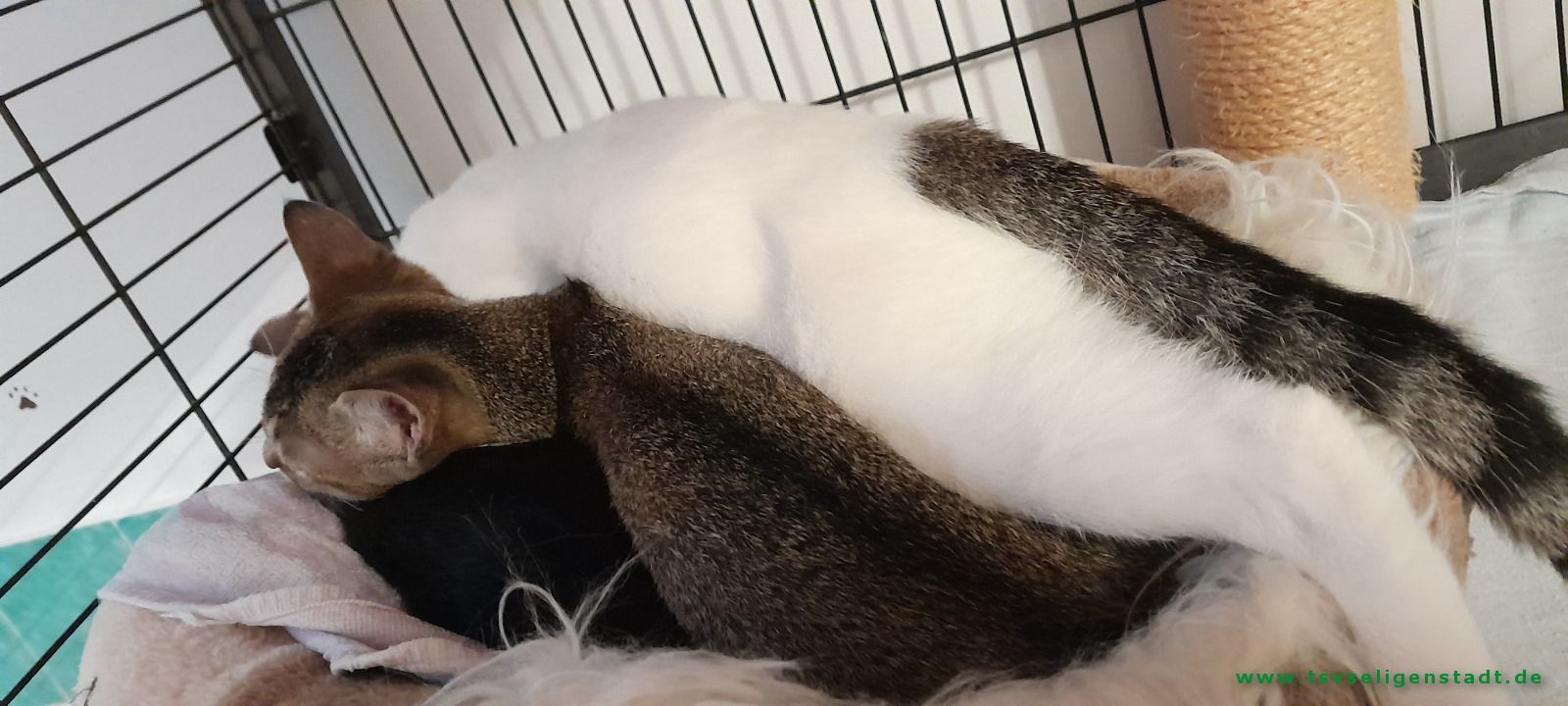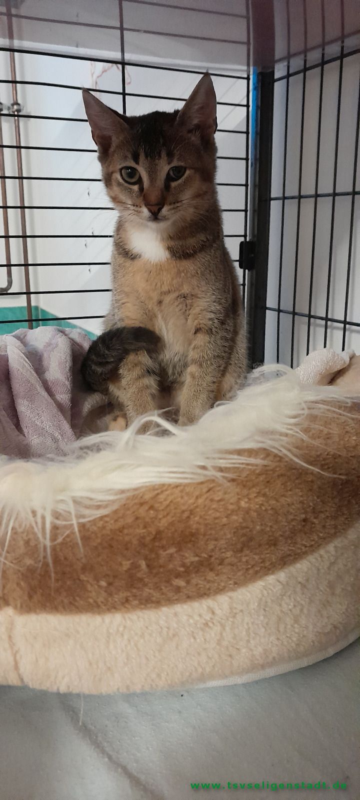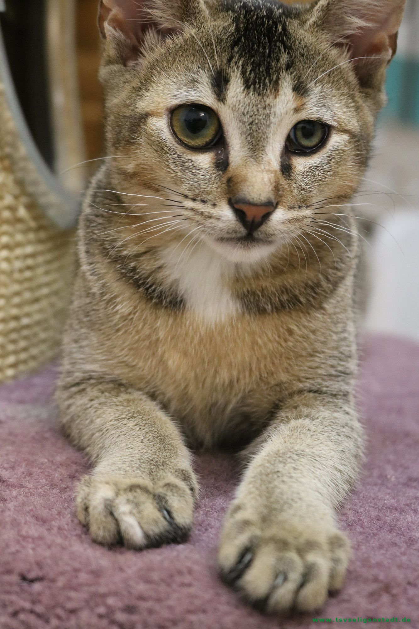 Von dem Trio Taiga, Zorro und Ben sind nur noch zwei da: Die erste im Bunde ist Taiga, auffällig bei ihr ist, dass ein Auge kleiner etwas ist, sie kann damit normal sehen und wird dadurch in in keiner Weise behindert. Taiga ist recht lieb, etwas ängstlich und scheu allem Neuen gegenüber. Wenn man ihr jedoch genügend Zeit gibt, wird sie sehr verschmust, mag Laufspiele und Klettern. Durch ihre außergewöhnliche, schöne Fellmaserung sollte sie als Freigängerin eher in einen großem Garten oder eine abgelegende Gegend ziehen. Taiga kann sehr gut mit Zorro.