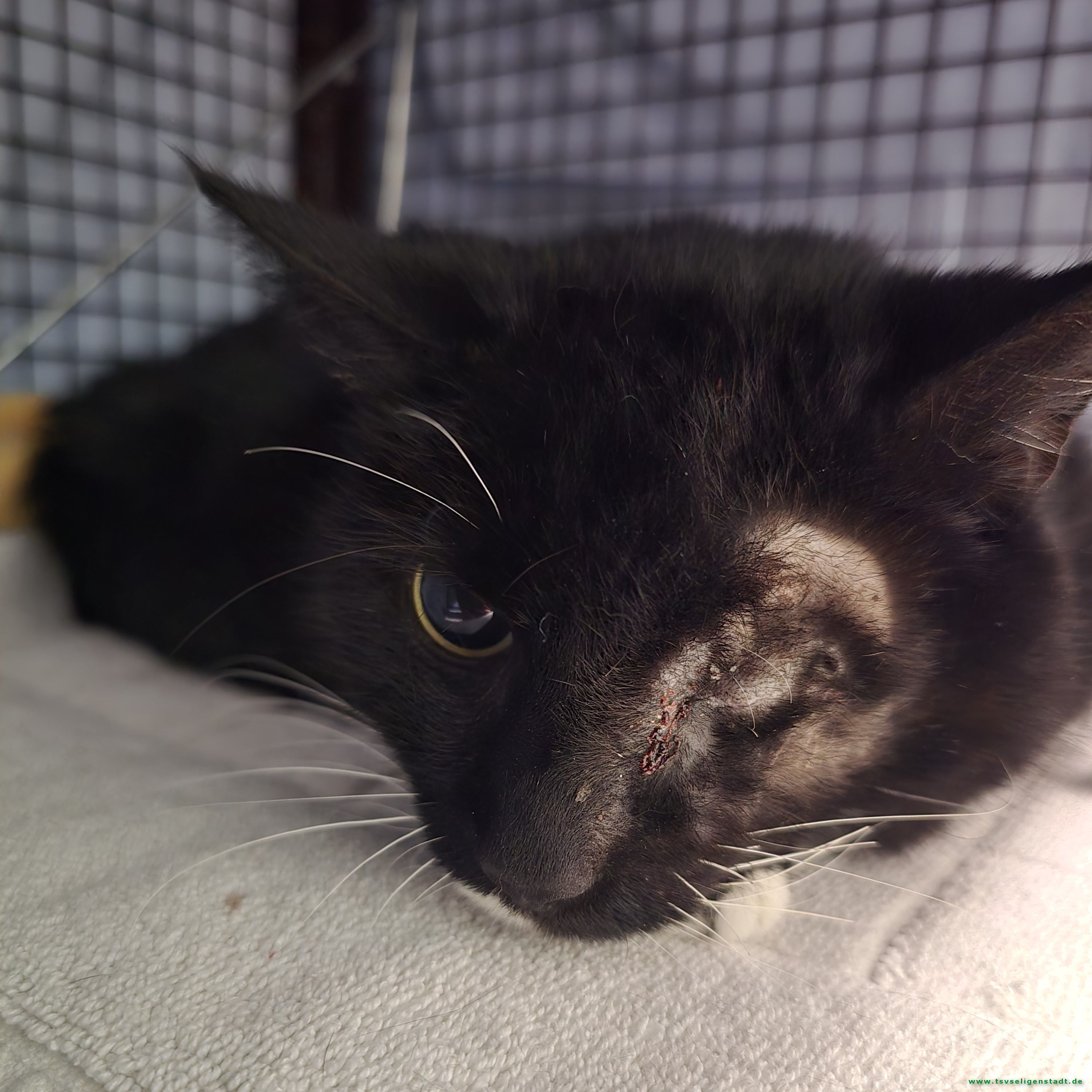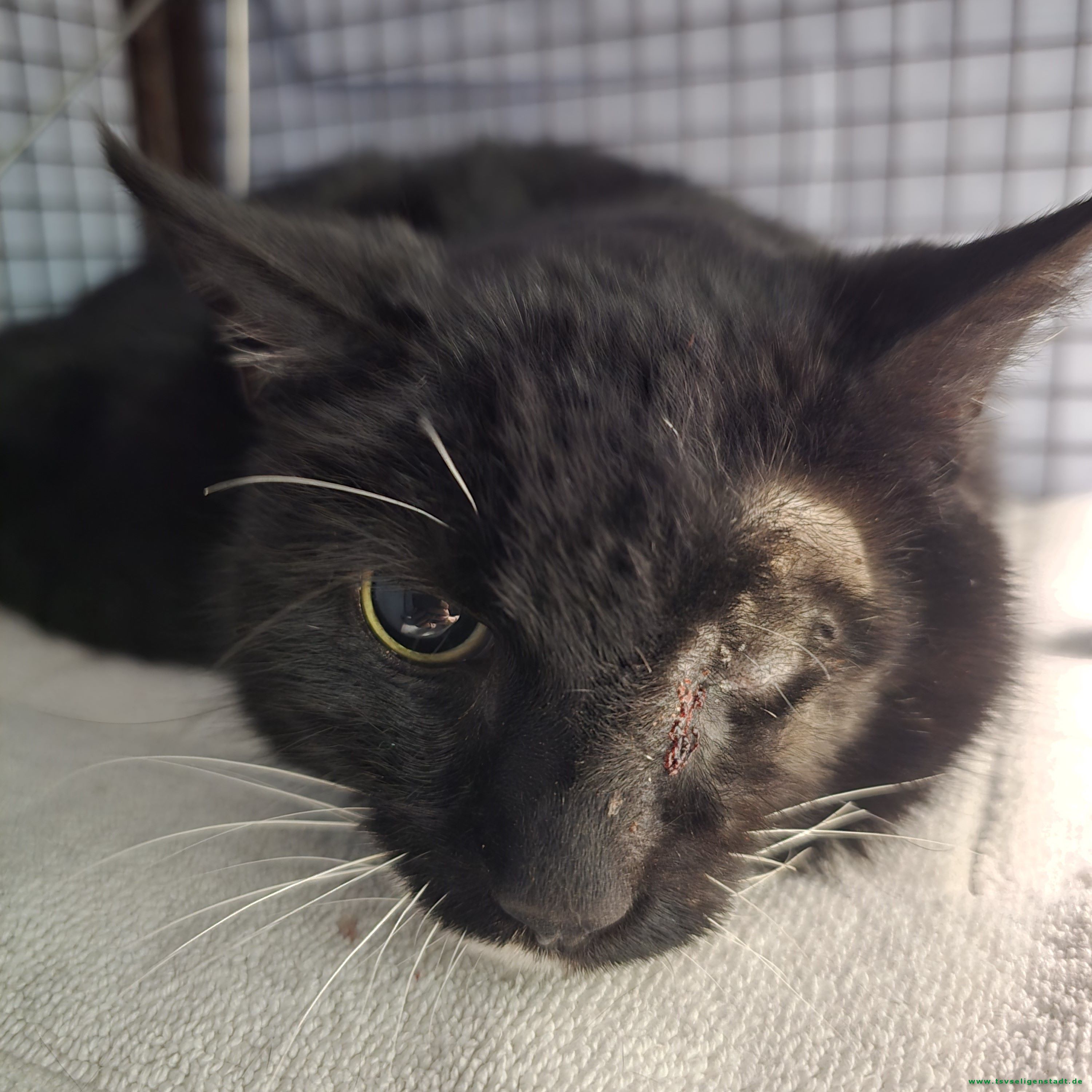 Mercy wurde in Froschhausen gefunden. Sie hatte ein sehr dickes Auge, welches blutete. Das Auge musste entfernt werden, leider sieht sie auf dem anderen Auge auch nur hell und dunkel.